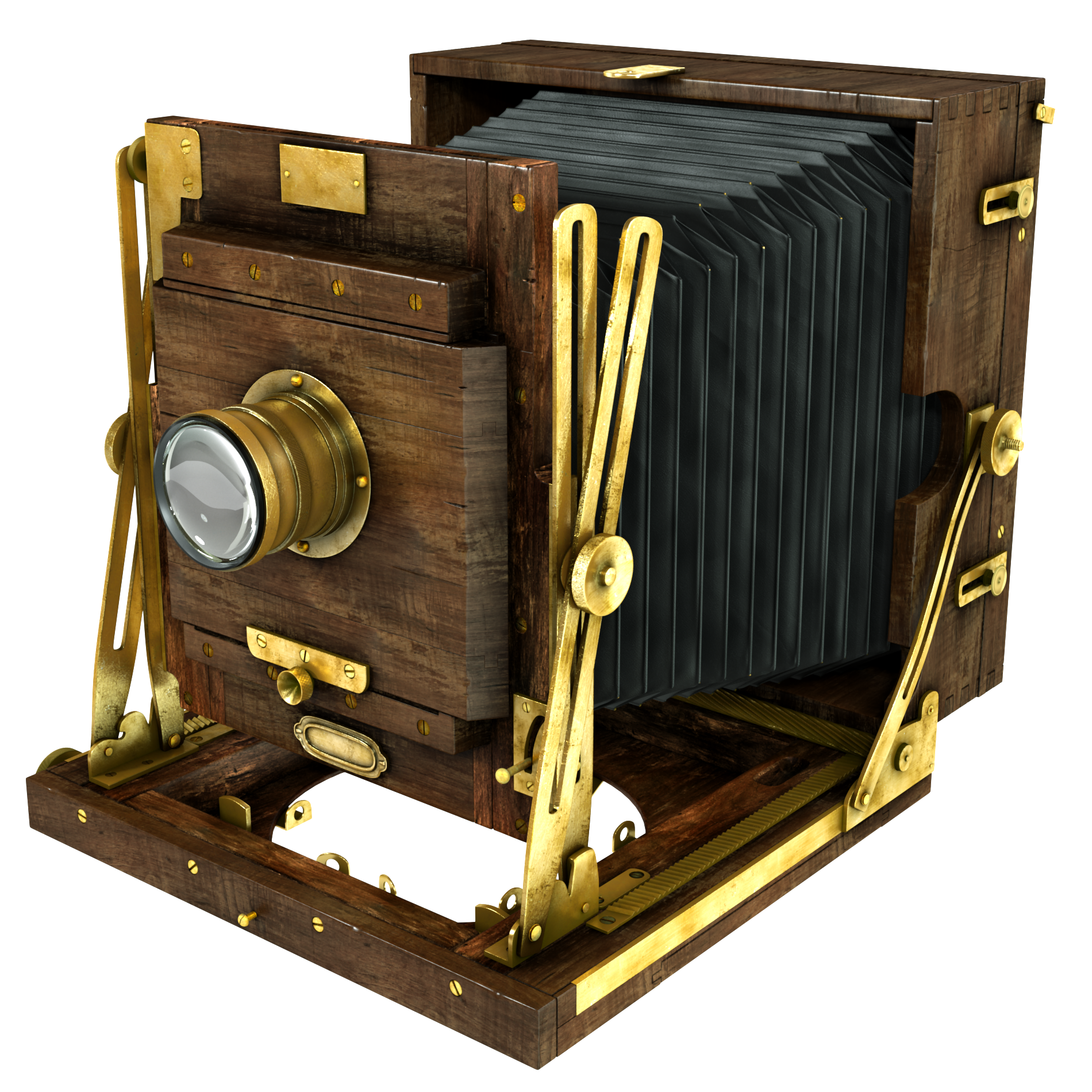 I've run across a photo of an old photo camera on the Internet and decided to replicate it in Blender. Unfortunately, it was only one shot and another side was almost covered from eyes. No brand name, so I couldn't find any other images of it.