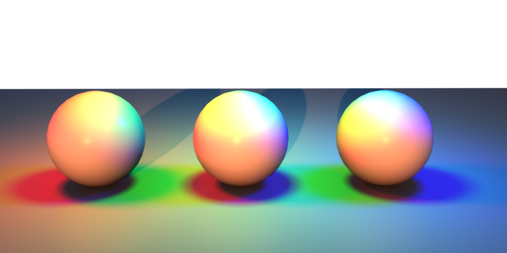I created a small example scene (granted, not really a realistic scene). It consists of 3 sphere on a ground plane. The lighting of the scene consists of 3 planes emitting red, green and blue light and a daylight environment: