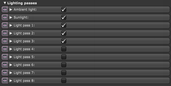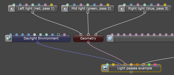 • Light pass 1-8: Light passes 1 to 8 capture the contribution from mesh emitters. Emitters (both texture and blackbody) have a light pass ID pin assigning an emitter to a light pass. It's possible to assign multiple emitters to the same light pass. If nothing is configured, all emitters contribute to light pass 1.