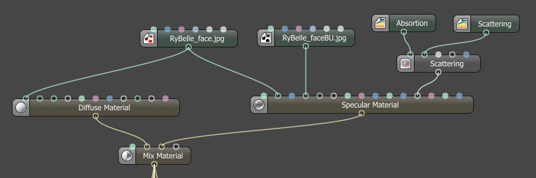 3.2. A specular material, to which I have assigned DAZ's textures in properties transmission and bump. The colors for the reflection and scattering properties, I have copied from Tonysculptor's Skin R20 material.