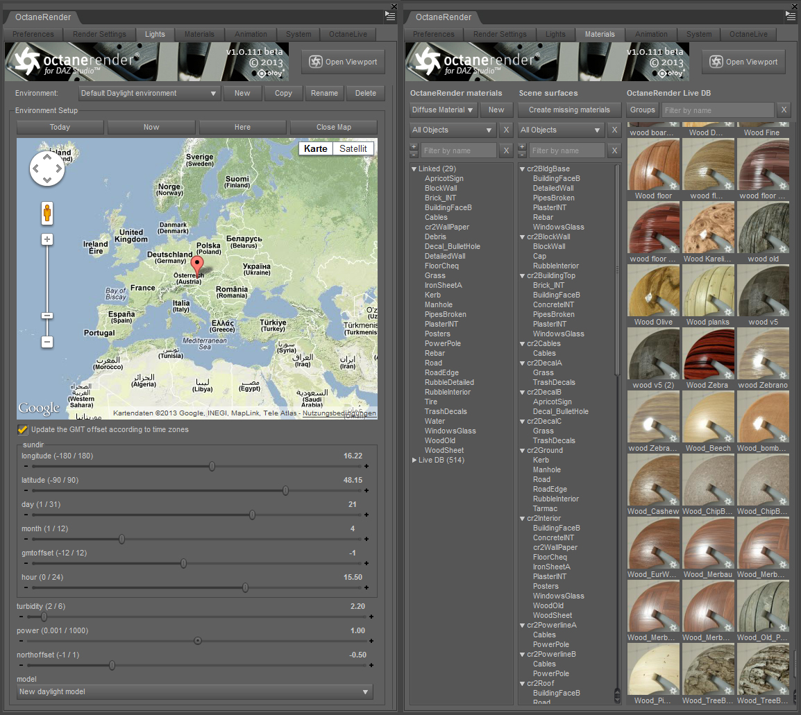 Using community made materials form the OctaneLive DB is fully supported. Live DB materials can be directly assigned to scene elements like own created Octane materials,