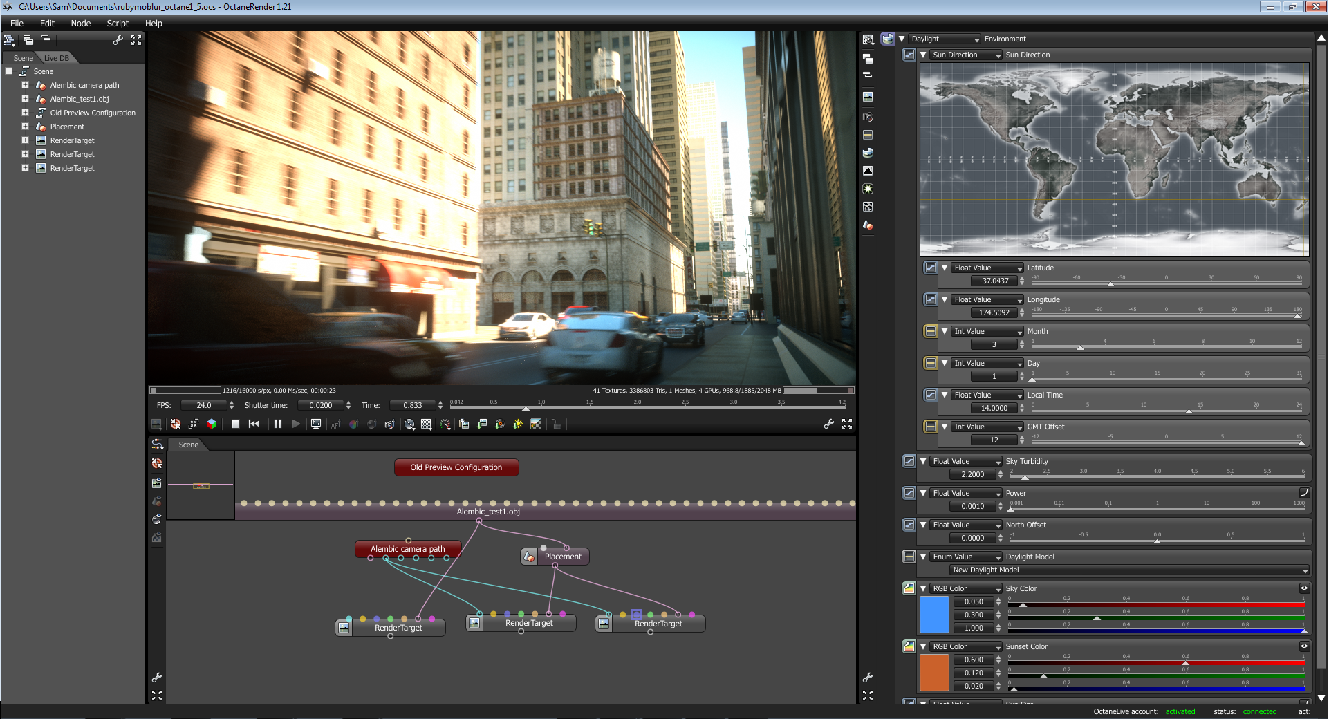 One of the more fundamental changes in Octane 1.5 is the addition of the concept of time represented in the UI by a time slider and shutter time attribute, which allow you to scrub through an animation in real-time with motion blur (only camera motion blur in Octane 1.5):