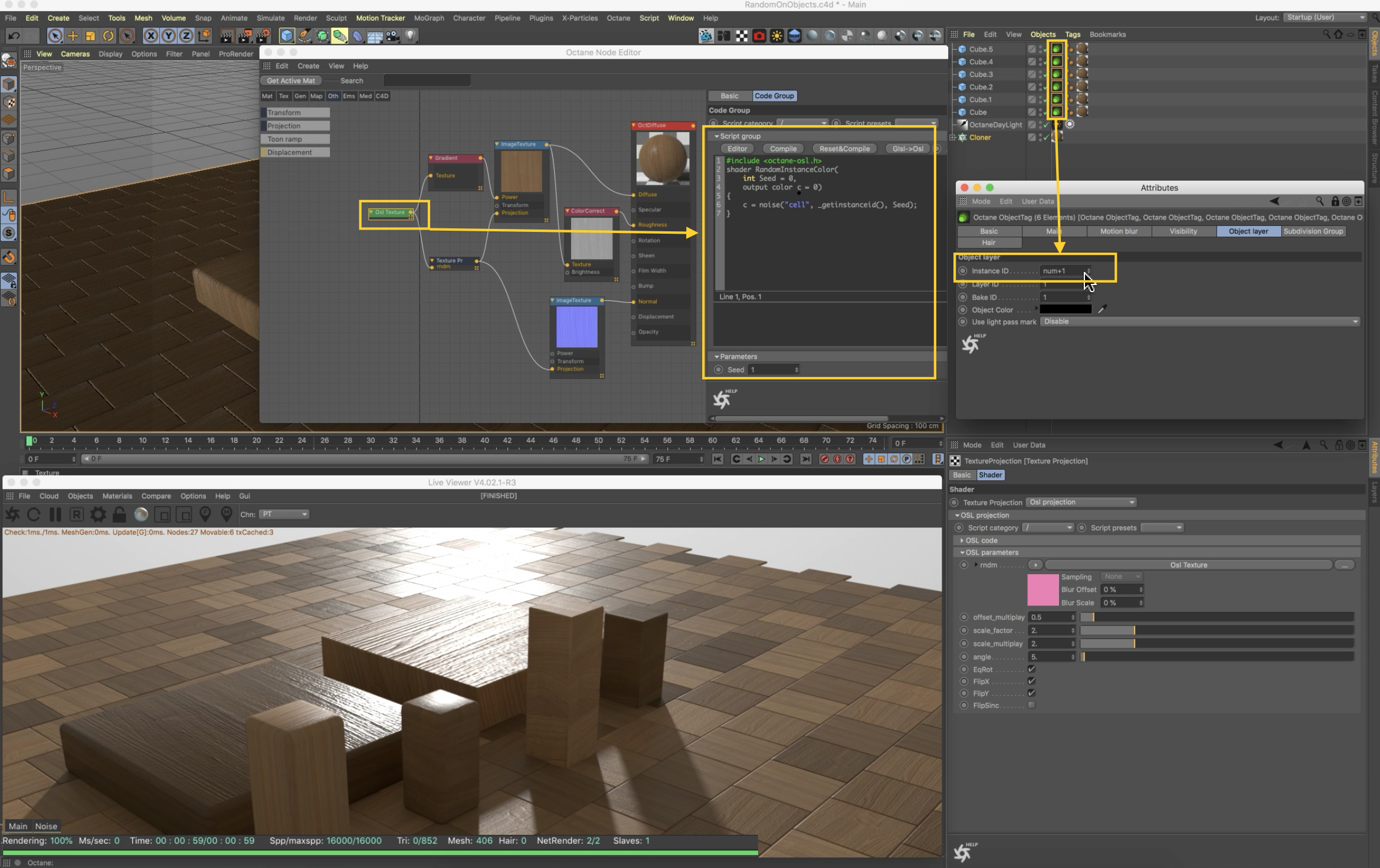 In Standalone you need to have a Scatter object connected to each different object: While in c4doctane you need to add an Octane Object tag, with differet Instance ID numbers, for example selecting all the tags, and entering num+1: Here is a a Standalone .orbx, and .c4d example scene with both osl scripts working together: Happy GPU Rendering,