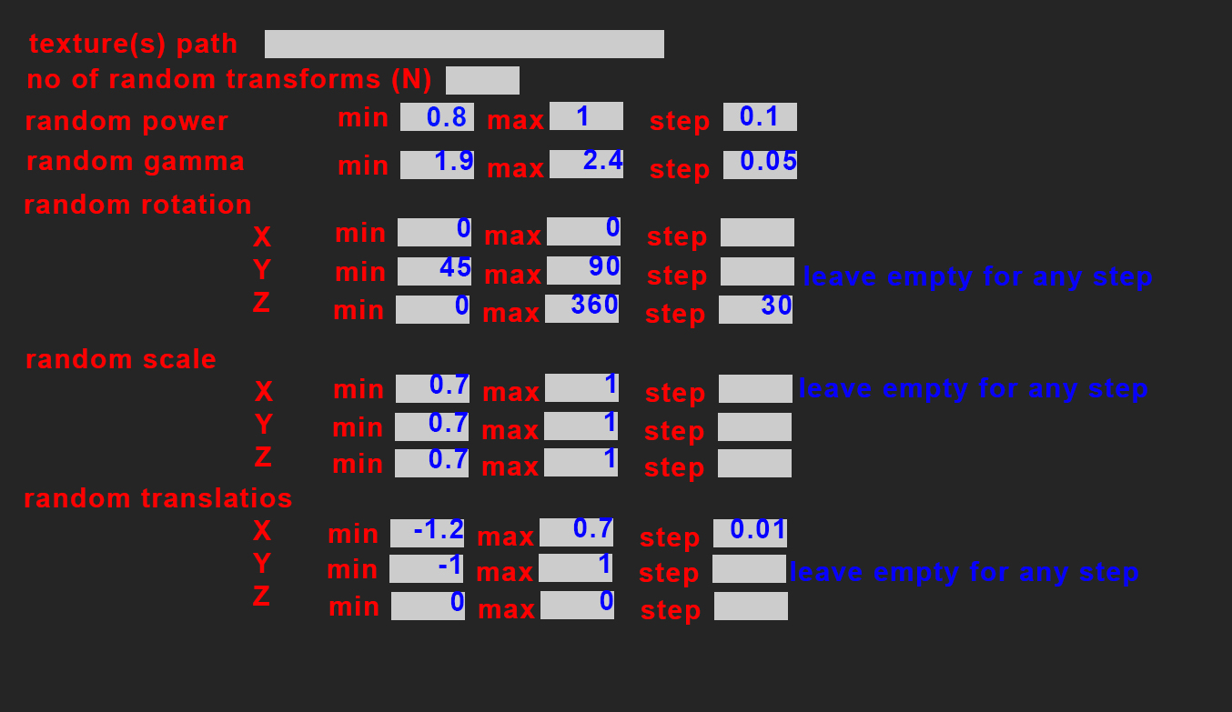randomly assign values (taken from the input panel)to the image texture 3D transforms, (also to gamma and power if possible);