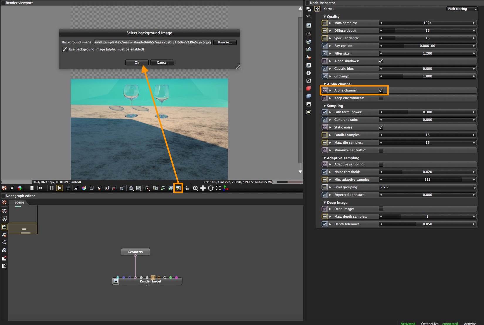 Let’s take this example scene: If the Background option is used, it is necessary to enable the Alpha channel option in the Kernel settings, but the Background image is not taken into consideration in reflection and refraction: With the VisibleBackground Lua scripted graph node, you need to assign a reference camera (by copy pasting the camera node, or connecting the camera expanded from the Render Target), and the image to be displayed as RGB Image texture node. In this way, the projection and uv transform node of the image will be adapted to perfectly feat to the frame buffer, taking count of the camera FOV and Shift value: It is possible to enable/disable backplate, reflection, refractions: