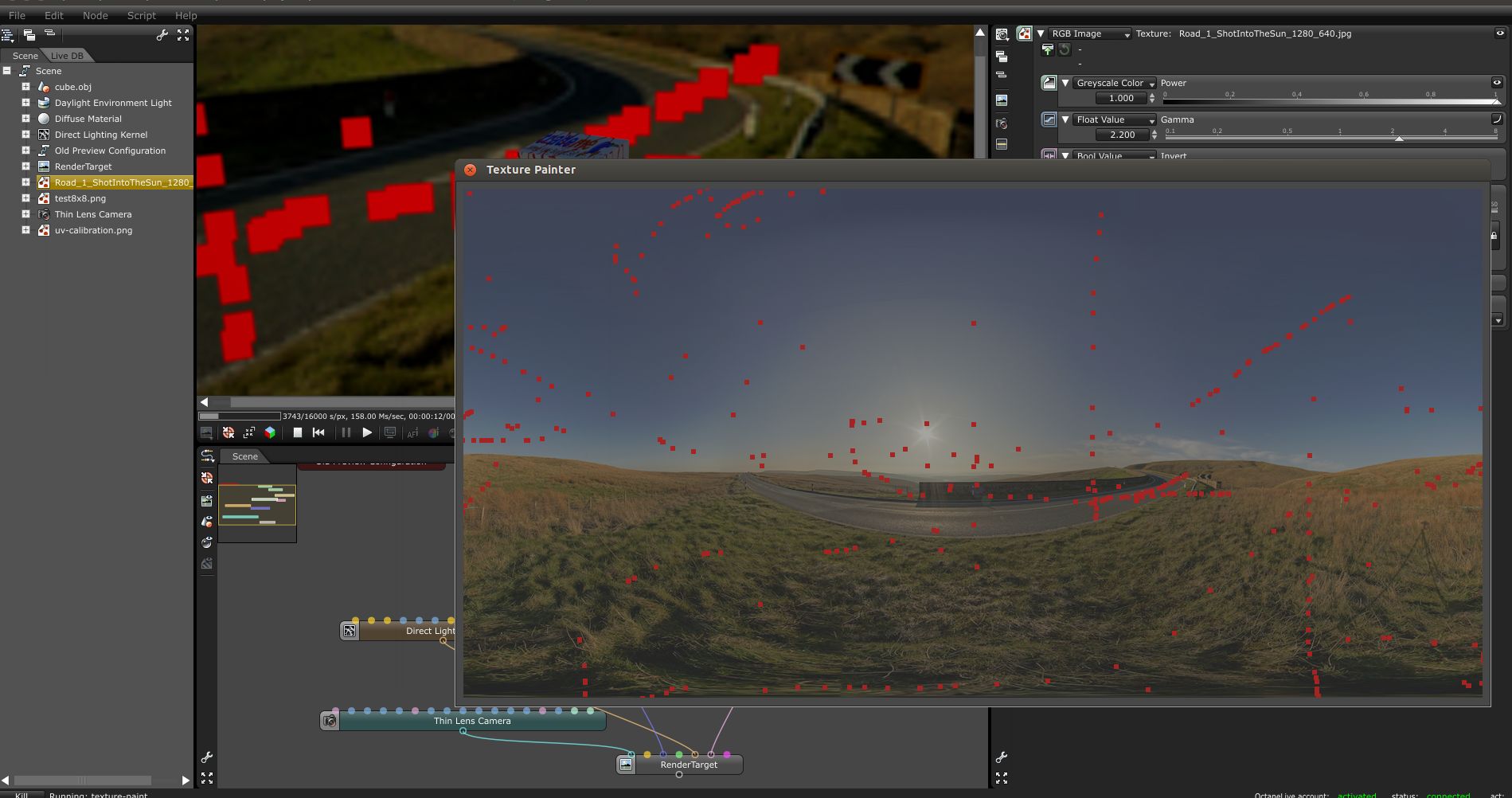In this example we do live texture painting. Just start rendering something, select a texture node and start the script. Now you should by able to paint some stuff on your selected texture. You can also use it to paint a texture environment. This is a proof-of-concept, not a production stable script!