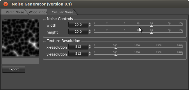I spent some of my (free) time creating a noise generator for Octane. The idea is to create an application where it's really easy to add new noise patterns based on the existing functionality. You don't have to worry about creating the user interface, that's all done automatically.