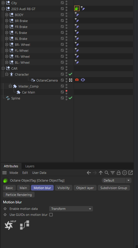 I have a car model rigged with the Cinema 4D character rigging tool. The octane camera is a child of the car so it moves with it. I applied an octane tag to the car geometry, but the motion blur still appears over the entire car.
