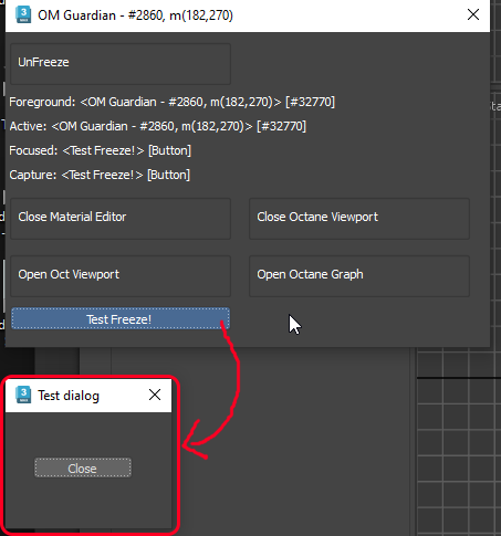 Reminder: when pressing this Test Freeze button, the Please close to freeze dialog is displayed. At this point, it behaves just a normal modal dialog, that capture the application focus. 3dsMax is not frozen at this time. But when we press the close button, 3dsMax is supposed to be responsive again, and resume operations as usual, but instead it can be 'frozen'.