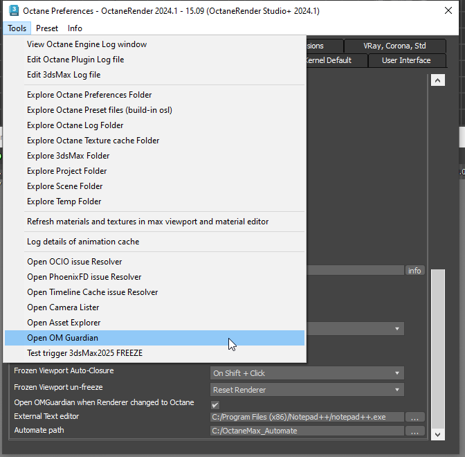 This will open the OM Guardian automatically when Octane is set as the renderer, or when loading a scene with Octane as the renderer.