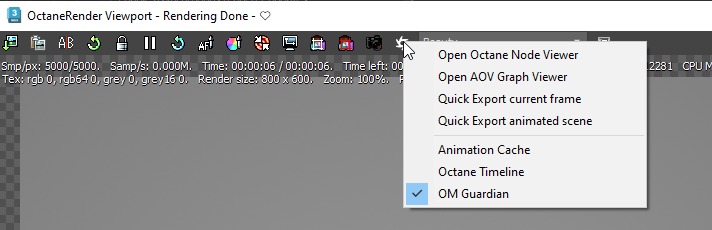 Note that the OMGuardian window can be open from the preference dialog, the Octane viewport toolbar context menu or main context menu: