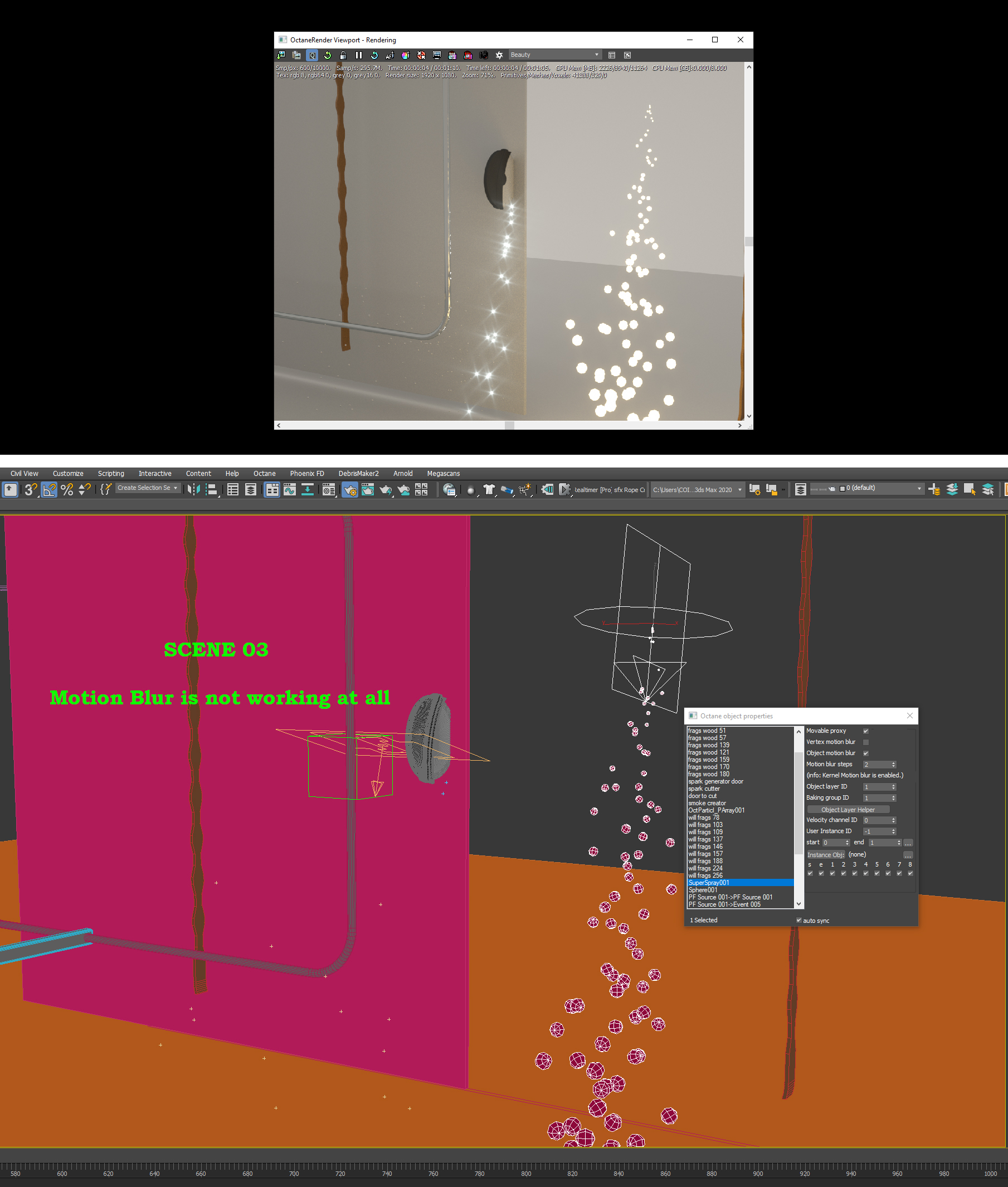B. Scene02 it just crashes max when octane viewport is opened. Something to do with pflow and octane motion blur