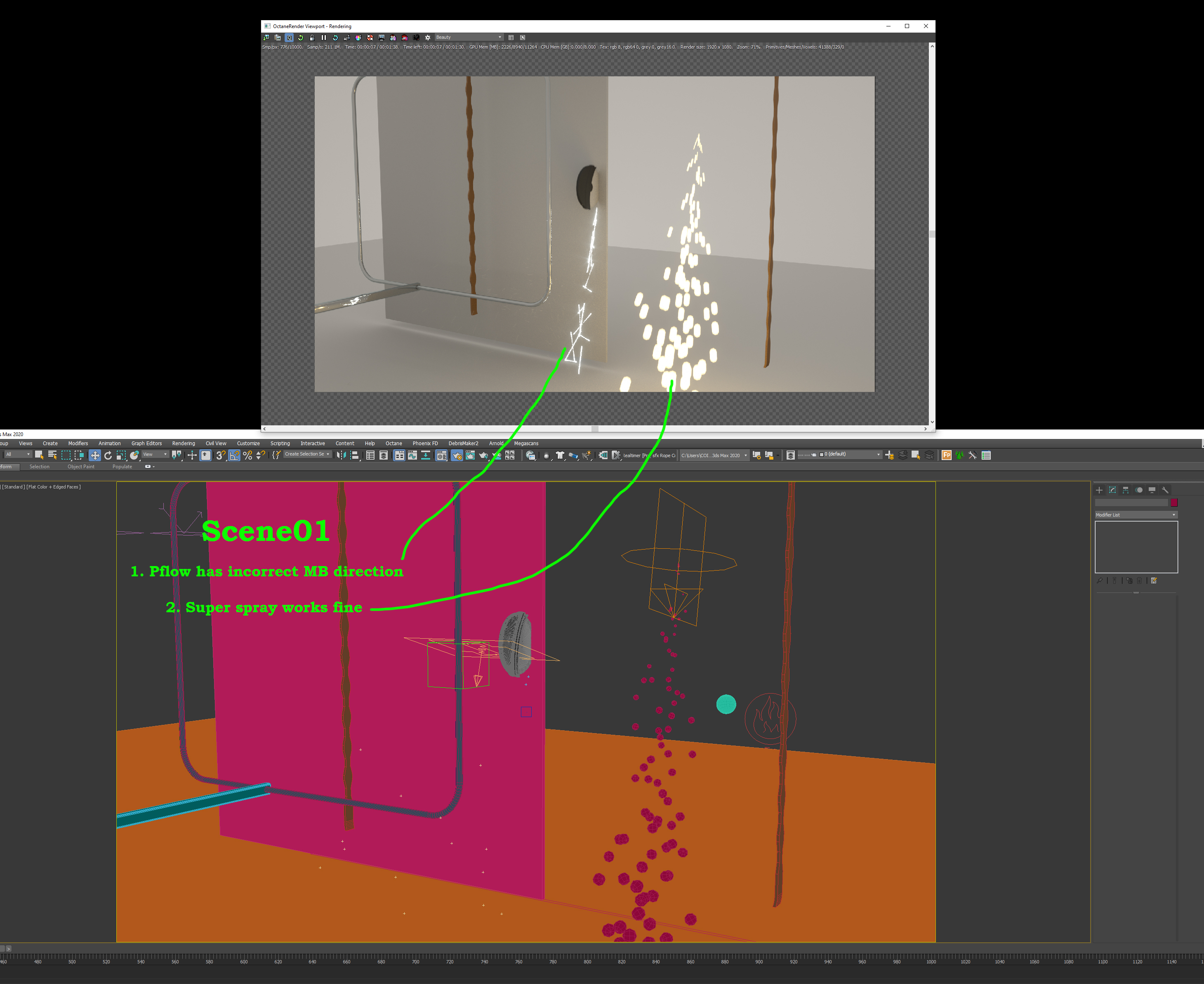A. Scene01 - Pflow motion blur has wrong directions. Super spray works fine. If you go to Pflow events, then choose octane properties and turn off movable proxies and MB - particles will disappear. If you check the boxes back Max can just crash.