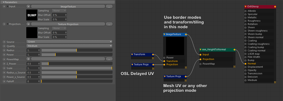IMPORTANT: For your ImageTexture node to work, you need to connect a Texture Projection node with ‘OSL delayed UV’ projection. Don’t worry, you can still add your own projection in the Projection input of the OSL shader.