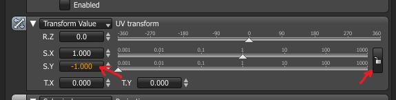 I see, thank you. I was in Maya and there the transform restricted the input to min 0.0001. But in Standalone it works flawlessly!roeland wrote:You can change the UVW transform like this: first disable the aspect ratio lock on the right, then set the S.y (vertical scale) to -1. You can do this by clicking in the text field on the left of the slider.