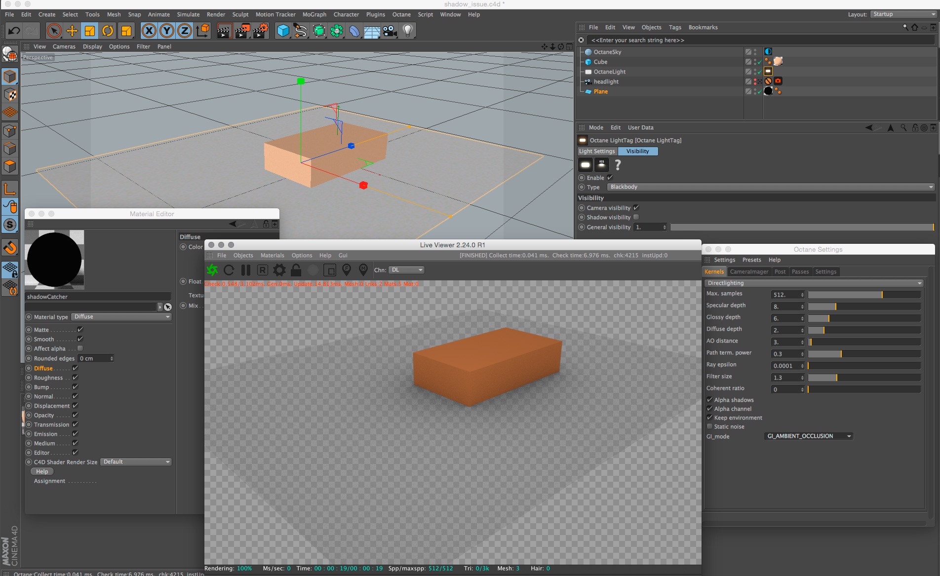 In this reduced scene you can see an even more exaggerated example. There is an OctaneLight inside the cube, as you can see there are shadows from the blocked light that reach the edges of the shadow catcher.