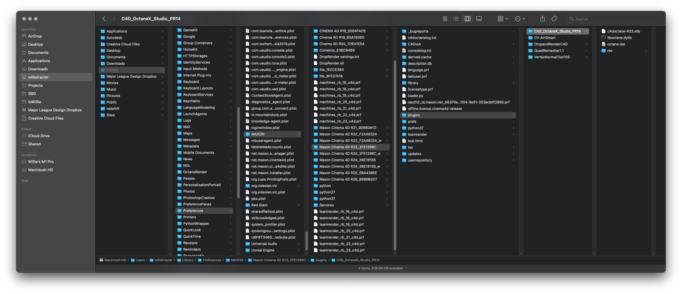 - Copied the C4D_OctaneX_Studio_PR14 folder to the User -> Library -> Preferences -> MAXON -> Maxon Cinema 4D R23_2FE1299C -> plugins folder
