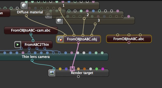 here is a Lua script for helping in the substitution of an obj static mesh with an alembic scene file: The script connect the materials only if the names of the alembic pins is identical.