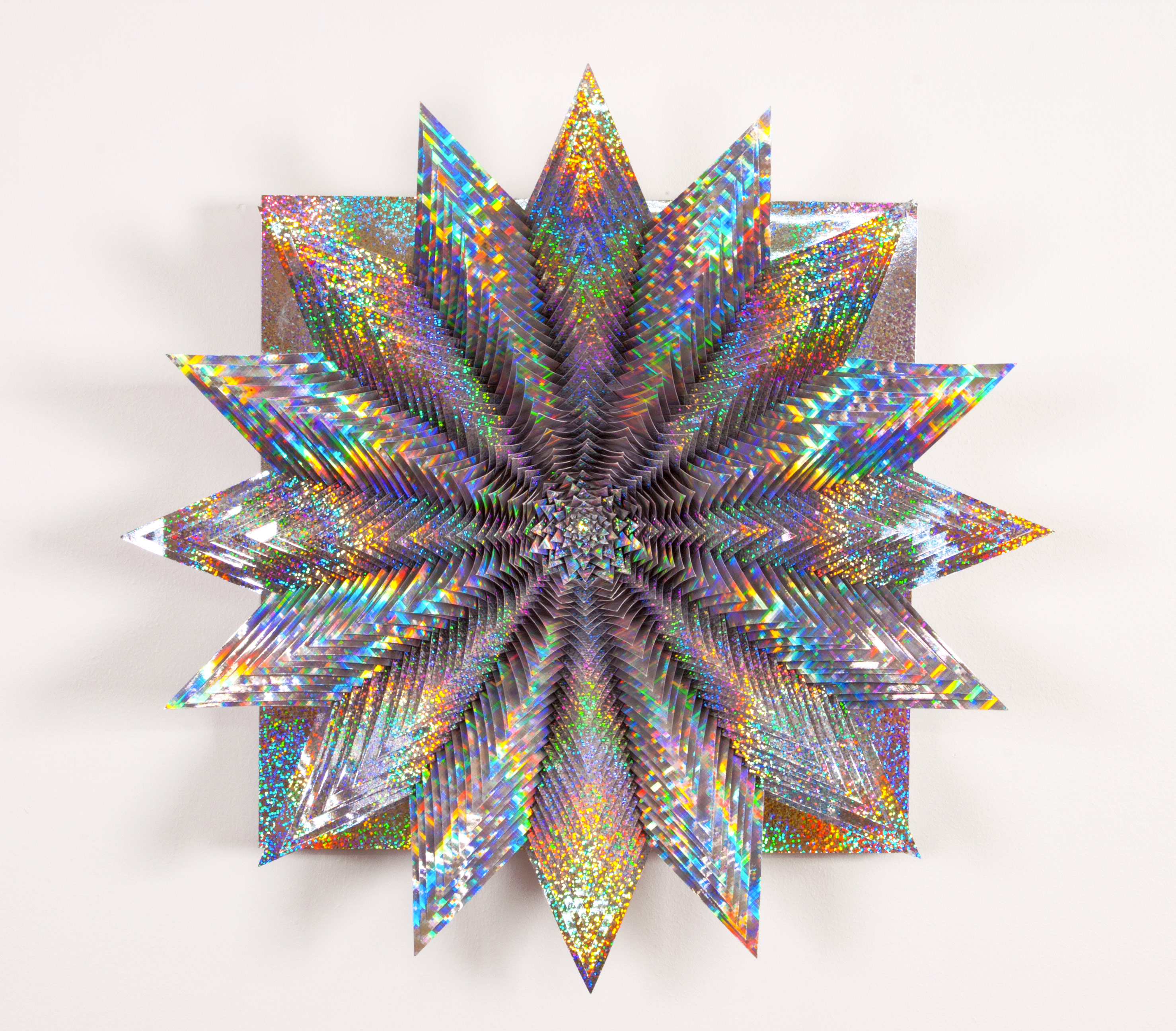 It's basically the same as holographic paper, metallic in appearance with flakes that show a colour based on the angle it's viewed as (iridescence).