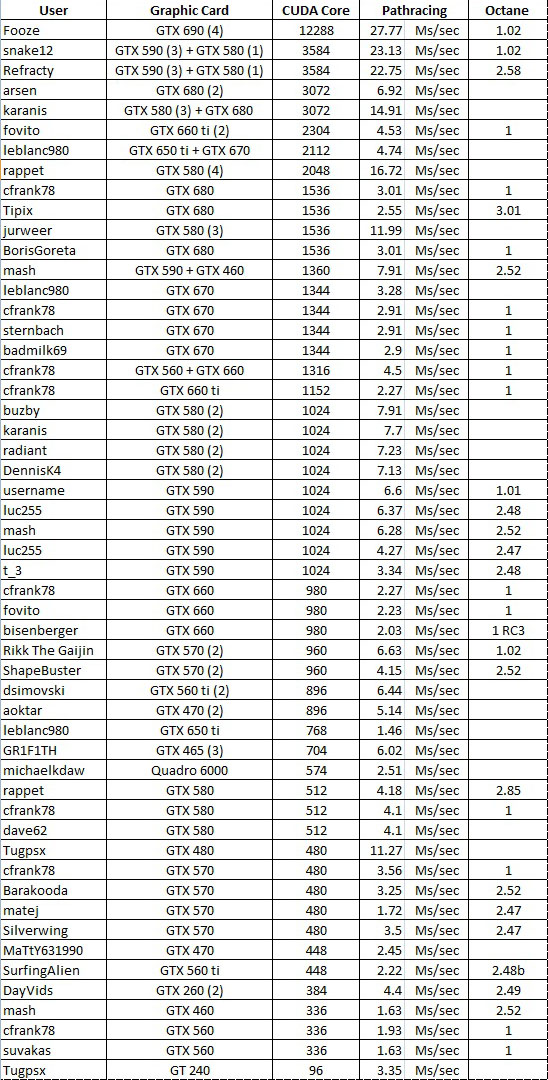 That not perfect data, to many various data such as different octane version, fermi and kepler, single and multi gpu.FrankPooleFloating wrote:igen -- would it not make more sense to list them in order of Pathtracing, rather than cores?... and perhaps divide 600/Kepler series cores by 3 (and call attention to this at top - that the Keplers are tweaked to reflect Fermi cores)?