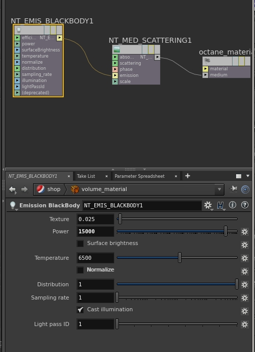 For emission, the Medium node can have either a blackbody emission node, or a texture emission node.
