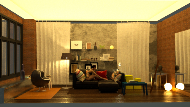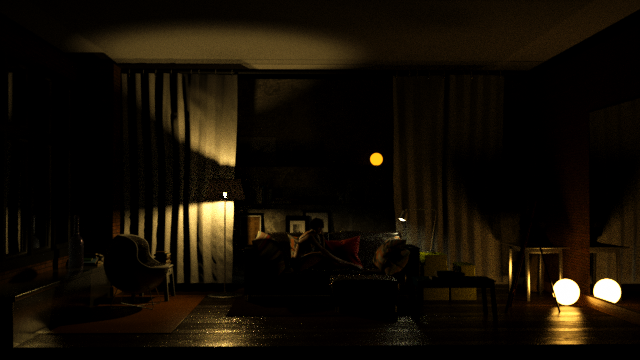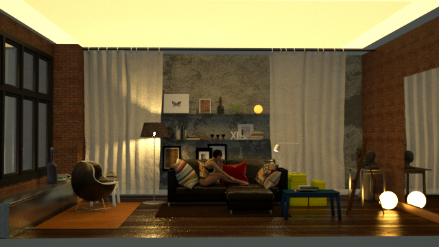 A ceiling light (temperature: 3000 - power: 100,000). I have created a false ceiling to play with opacity: