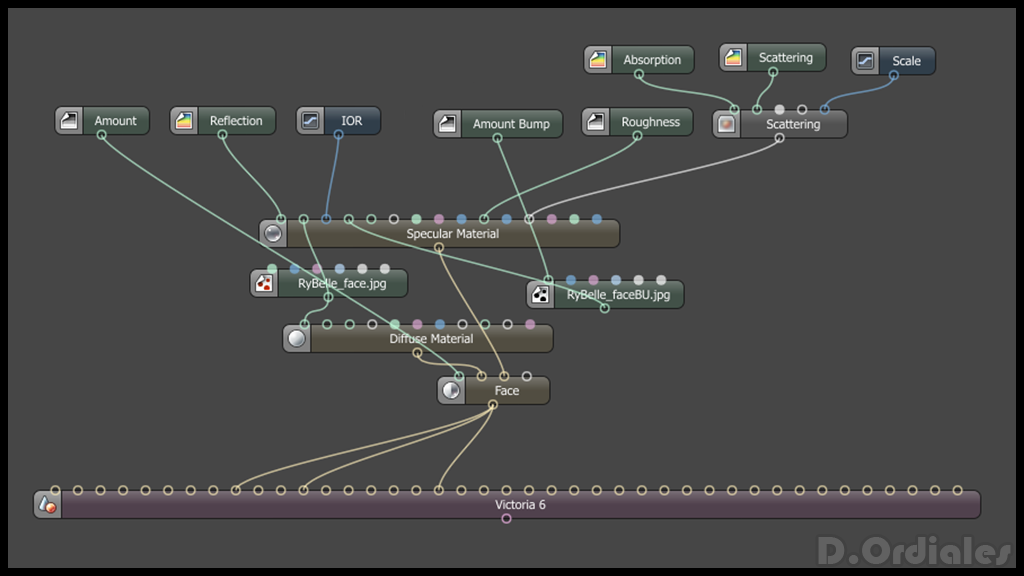 Transmission properties of our material. In the next picture you can see the scheme for nostrills, lips and face areas (surfaces from DAZ):