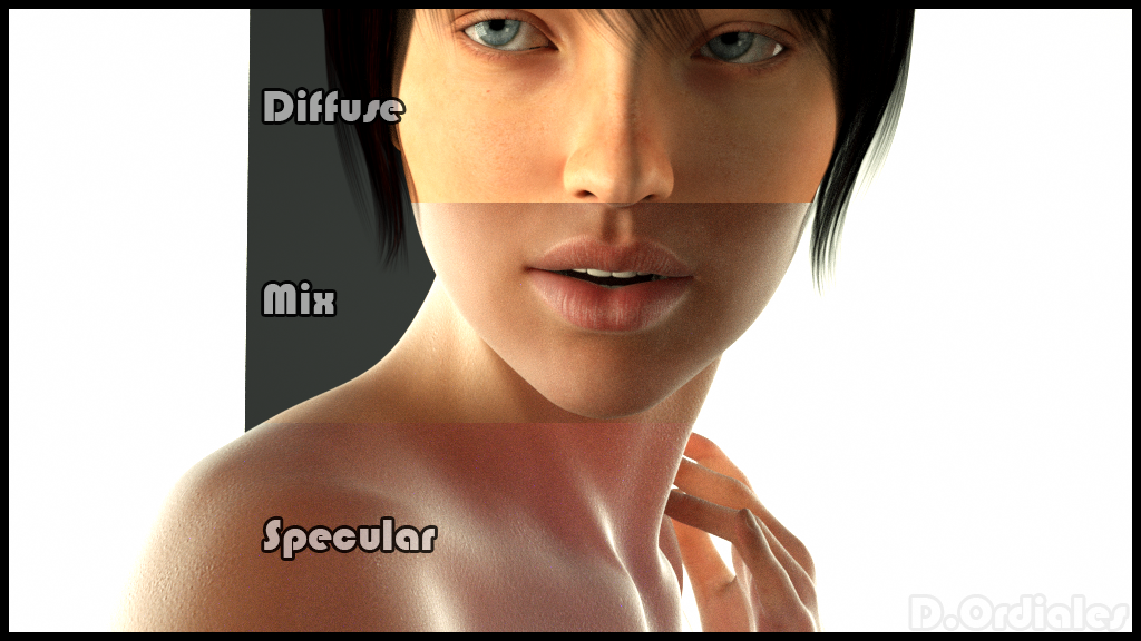 the final result at the top of the diffuse to which we are applying only one color material; at the bottom of the material specular, which is about to have done most of the settings; and finally, in the middle, the result of mixing in a proportion of 30% and 70% respectively: