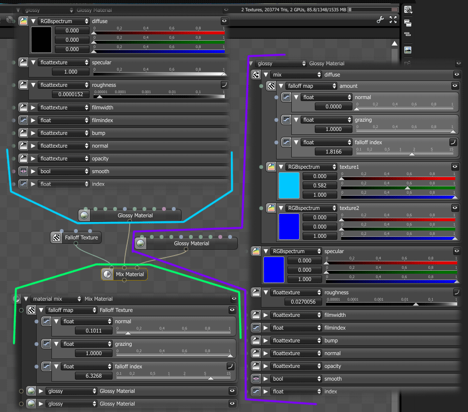 Side note: is it possible to make one node for octane materials or make a switch inside the nodes to change the type of the material to diffuse, specular or glossy, wile keeping all the texture and color, set by the users inside the node, like in the standalone version. To be able to switch between the type of materials after we put textures and settings?