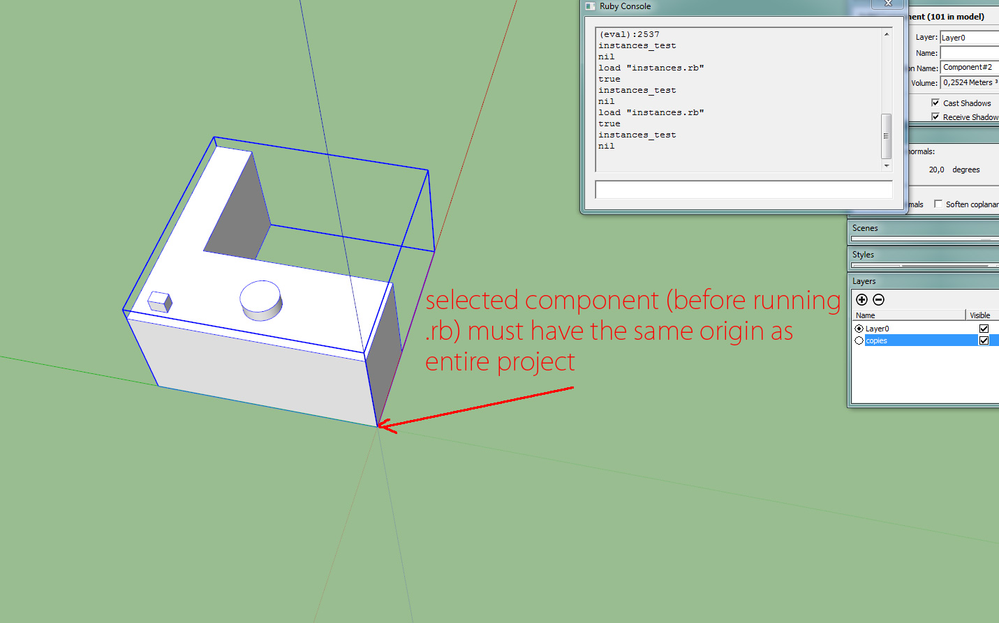 Before running the script I moved one of the copy of components into the project origin, to make its axes overlapping axes of the project. Then selected it and type command for running the script.