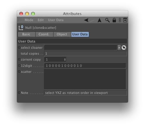 - drag the cloner to be scattered in the proper field in the user-data tab of the "clone&scatter" object