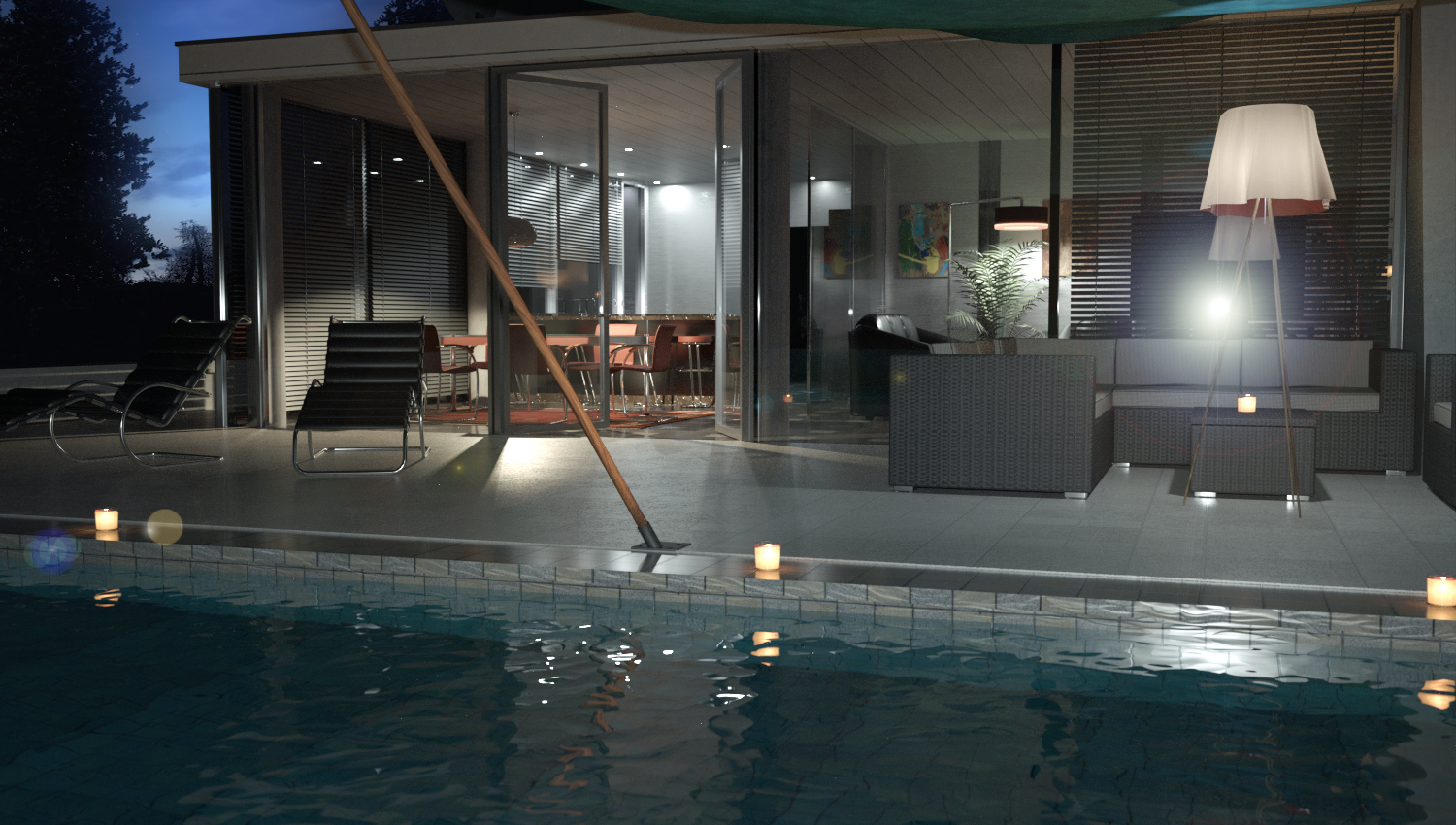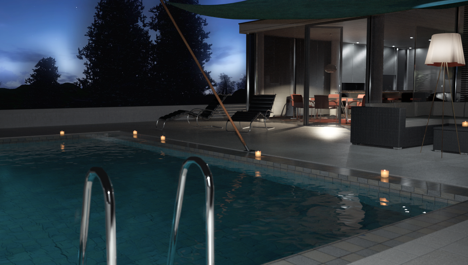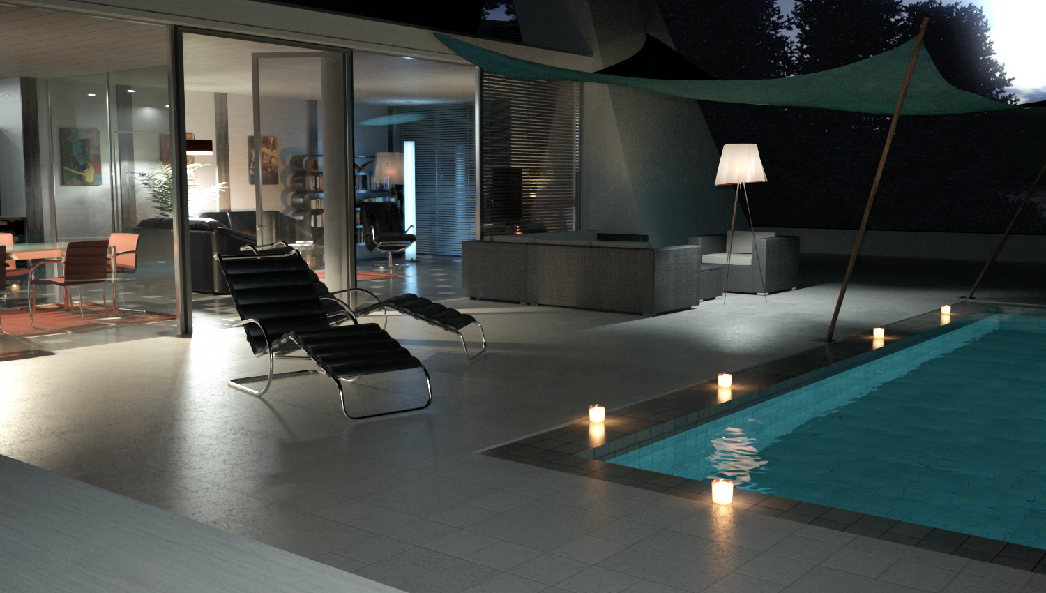 The bright reflections on the ground/tiles at the base of the windows is not being reflected back onto the glass? this is an odd look (the pool scene)