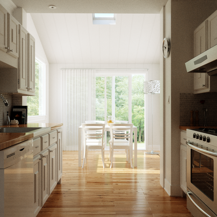 All the light in the kitchen is indirect light coming from the lounge, which makes this scene hard to render.