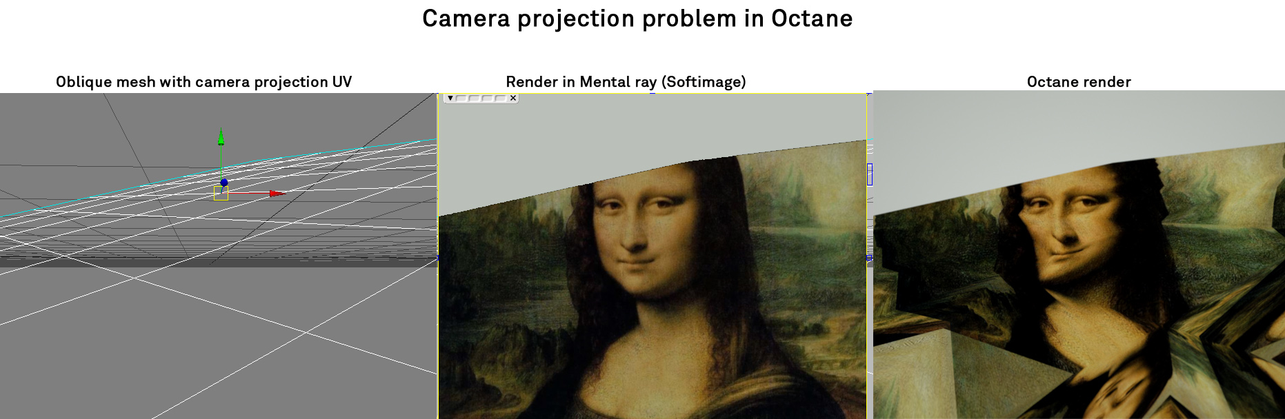 When I render my meshes with camera projected UV's and textures in softimage I have the result I am expecting, but when I switch to octane the textures get completely messed up, specially when the surfaces are more oblique to the camera.