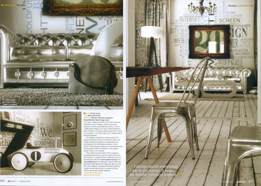 My Alpha Rest Room has been published in the last november issue of 3D World magazine and this helps to proceed on working for nothing else than some satisfaction ;)