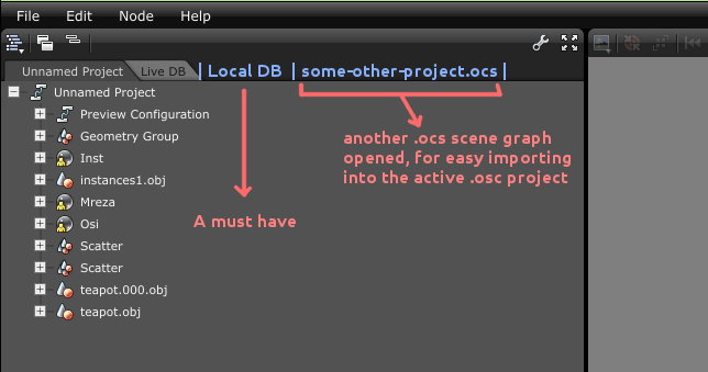 2.) Another useful thing is the ability to open some .ocs scene graph in the outliner & drag&drop stuff (nodes) from it in the active project. This way the user doesnt need to first open the other .ocs, then export the needed nodes into .ocm files, then re-open the working .ocs and re-import the .ocms there...