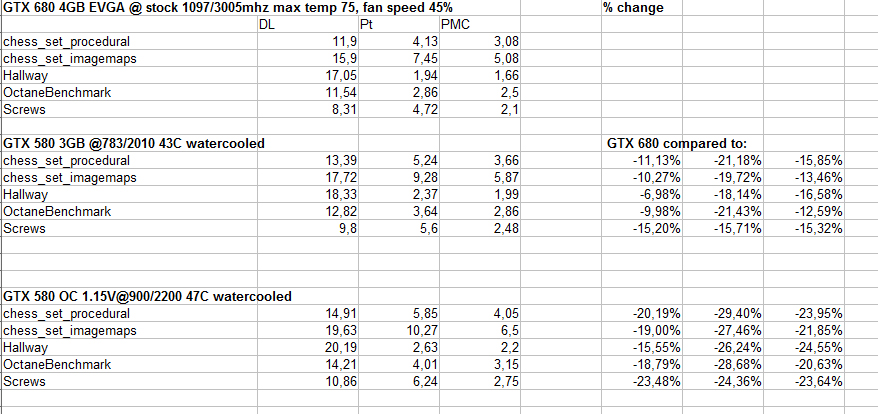 I'm attaching scores compared to GTX 580 3GB on Octane 3.03 and nvidia 306.23 driver, cuda 5.0.