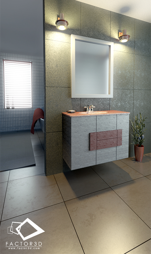 I don't like too much the cabinet shaders (don't understand what kind of material should be the top part), even the tiles of the other wall didn't like me...maybe you could try with an half or 2/3 tiled wall.