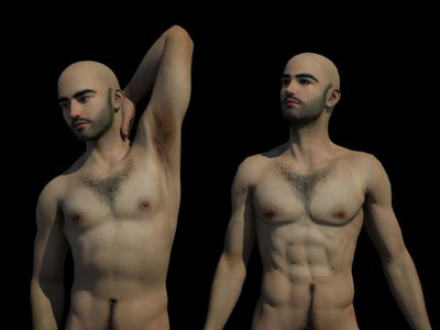 The first render used Octane whilst the second used the Poser Firefly renderer. The M5 character in the Octane render shows artefacts (the black "darts" on the shoulder and torso) that are not present in the Firefly render. The only tweaking I did to the Octane scene was to hide the extremely annoying eyebrow on the M4 figure.