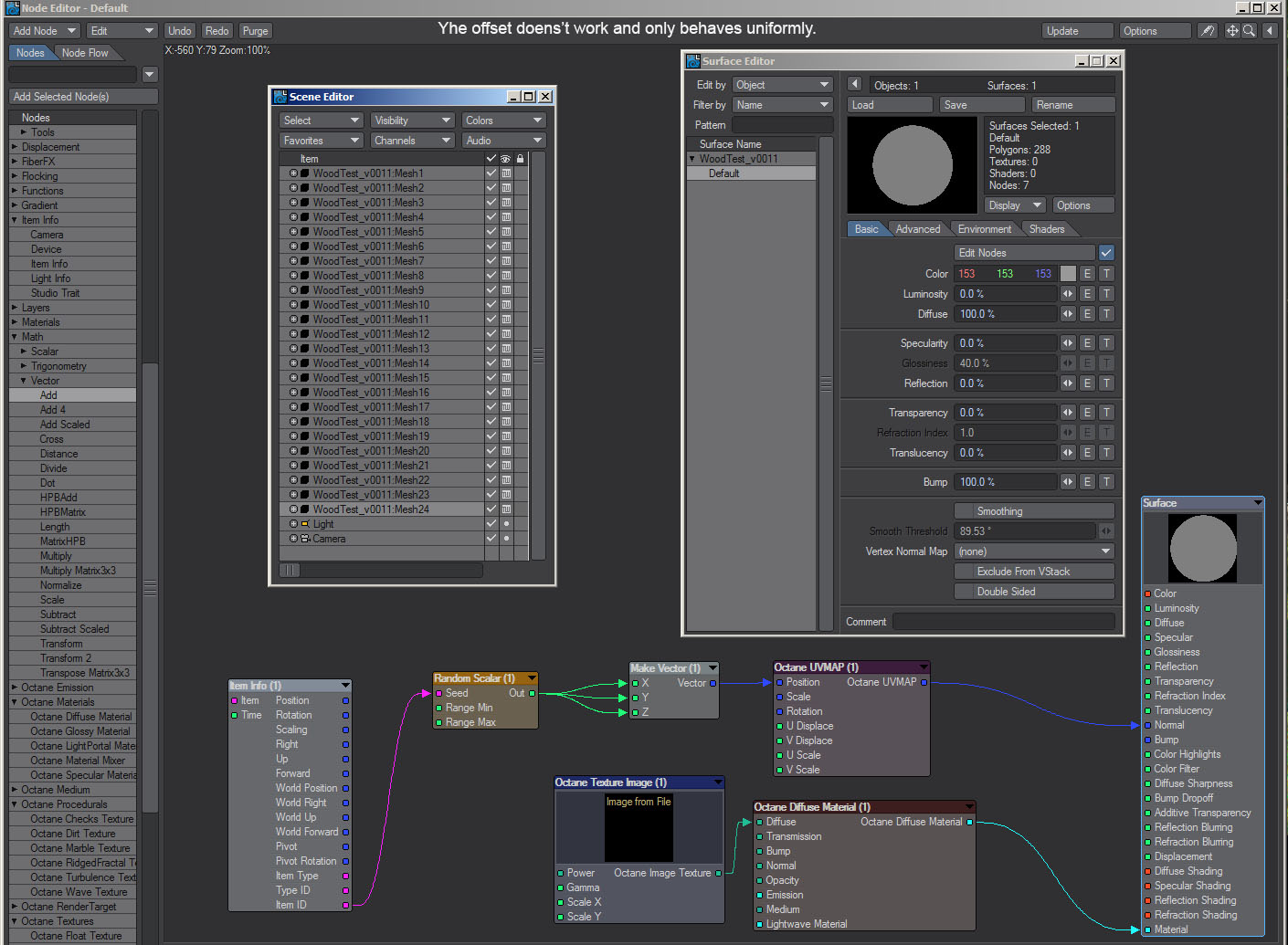 Currently there is no workaround for this issue. Plugin use a custom ray casting code to pick the object's surfaces because neither Octane or LW APIs have surface picking, but this custom code is not compatible with instancing. Perhaps in the the future Octane could have it's own native surface picking to allow instancing surfaces picking.funk wrote:Another bug report: Shift+clicking instances doesnt bring up the material editor. It probably has something to do with the fact that it isnt real geometry. Hopefully there is a workaround