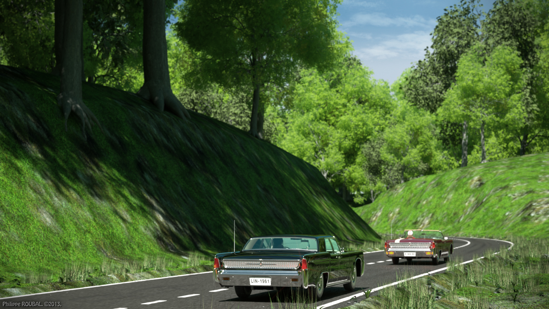 I erased the second car in Photoshop Elements for the foggy morning image. There are still many flaws like bad grass, and too many procedural textures on the sides of the road. I am fixing that. I am also not happy of the translucency of the trees leaves.