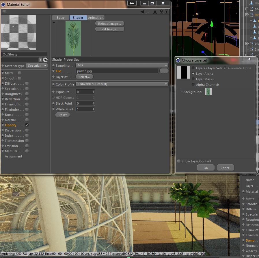 use Octane material, put imagetexture to opacity with alpha image or white/black images for opacity. Tou use alpha of image, you may change mode of imagetexture to alphabuzby wrote:I am trying to get the palm leaves here to look right. I am sure I overlooked somethingI can get it right in C4d but it does not render right in Octane. Any ideas?