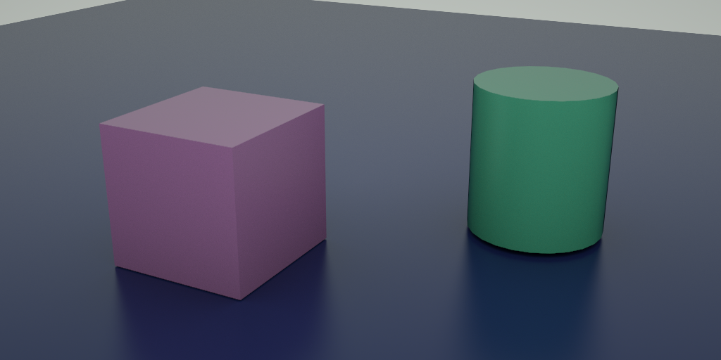 In Blender, I didn't do anything to the default cube, but I put it on it's own material so that I could control the "Smooth" parameter of the material independent of the cylinder. For the cylinder, I used smooth shading and then used an EdgeSplit modifier which breaks the cylinder surface into the two caps and the side (while still retaining a single object).
