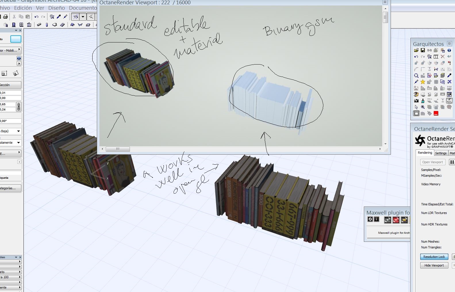 I'm importing a model to Archicad. A column of books. To save textures I have baked the textures of the books in c4d. When I save the object I can save it like "editable" or "binary"... If I select "binary" it's supposed that the textures are embedded in the gsm. Well it works in the "open gl" view but in octane it's white...