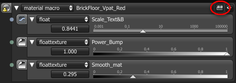 If the node graph of a macro node contains input nodes (which are displayed as input pins on the node itself) the input pins will be displayed as default. This hides the internal node graph. Using the icon marked above you can switch to the node graph that is connected to the output node, hiding the input pins.