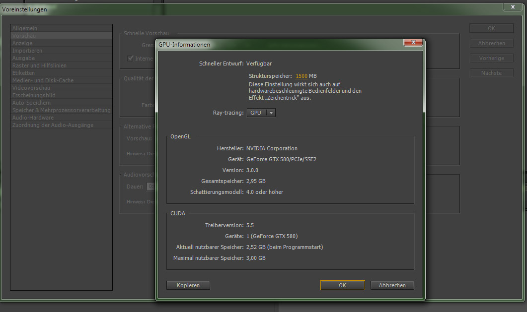 And here the gpu information of the preview tab in after effects, after only activating one GPU in the nvidia control panel. If I don`t deactivate the other gpus for AE, I have issues while using them in octane or even if they are not in use. Seems like AE cannot handle more then 3 or 4 gpus.