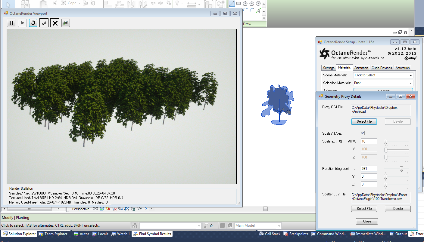 To answer the question on the randomizer.....you can load any OBJ mesh into the Octane scene in place of a Revit object. For example, you can assign a Revit RPC person with an OBJ person mesh. For Revit elements which are assigned OBJ proxies like this, you can load a transform CSV file (as you would with Octane Standalone) to "instance" that OBJ mesh many times. If the "randomizer" plugin can write the instance transform to CSV, you could load that into the plugin.