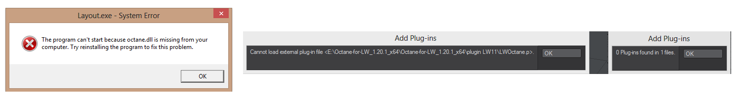And what happens if now you add the Octane.dll and Octane.dat files to your LW/bin? ... if LW show this error could be because it has the plugin installed, at least some of it's internal plugins ...