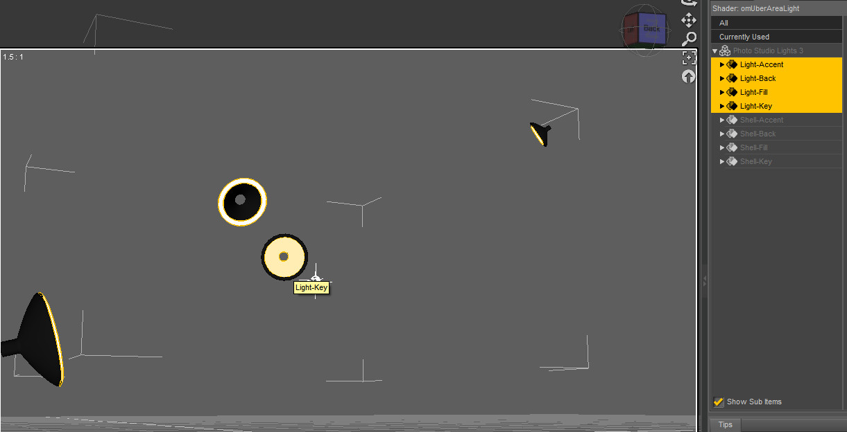 The product (or at least the one I own) consists of a figure loaded into the scene. It is 'rigged' with each bone comprising one of the lights of a studio setup, with initial positions being a 'standard configuration'. Each light comprises the geometry of a physical lamp, with each having two surface materials: one for the shell of each lamp and one for the actual light/bulb/light-emitting part, and it is that part that has the UberArea light shader applied to.