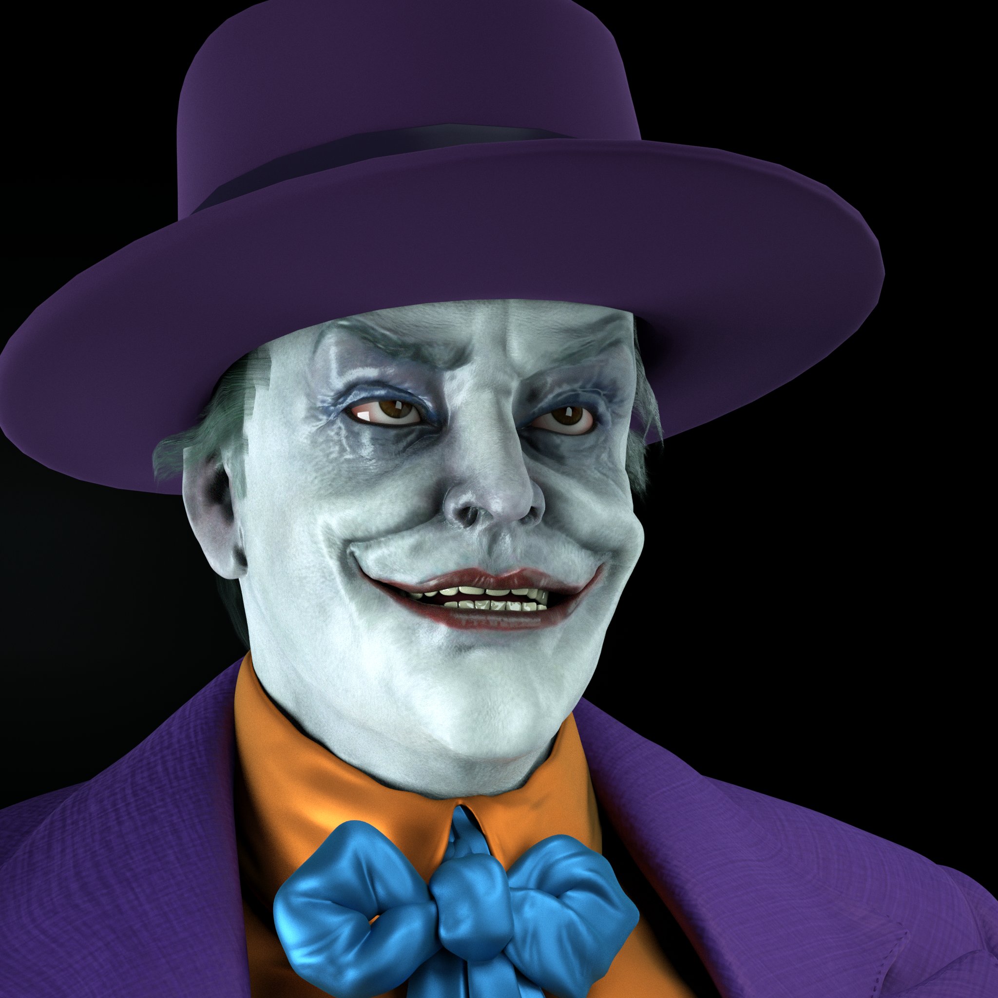 This looks pretty good ;). But I think you could improve this. First the joker's skin could be improved as it looks a bit plastic or maybe add some extra detail to smooth contours around the face, also you'll want to break the edges of the hair to remove those intersections with the sides of the head just editing the maps will do. Secondly putting better lighting to help emphasize the characters background. In this case maybe having a spotlight above him and some reflected light back to his face will give a way twisted sense to it.
